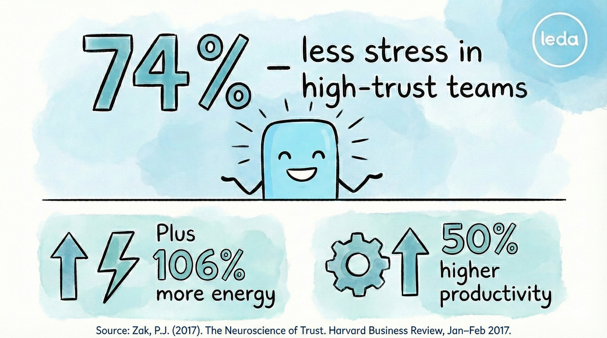Paul Zak's research on the neuroscience of trust found that people in high-trust companies report 74% less stress, 106% more energy at work, 50% higher productivity, and 76% more engagement than those in low-trust environments. They also experience 40% less burnout and 29% more satisfaction with their lives.