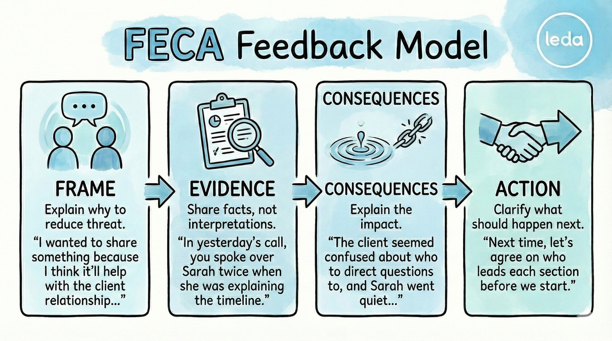The FECA model (Frame, Evidence, Consequences, Action) gives leaders a structure for delivering feedback that reduces threat responses: